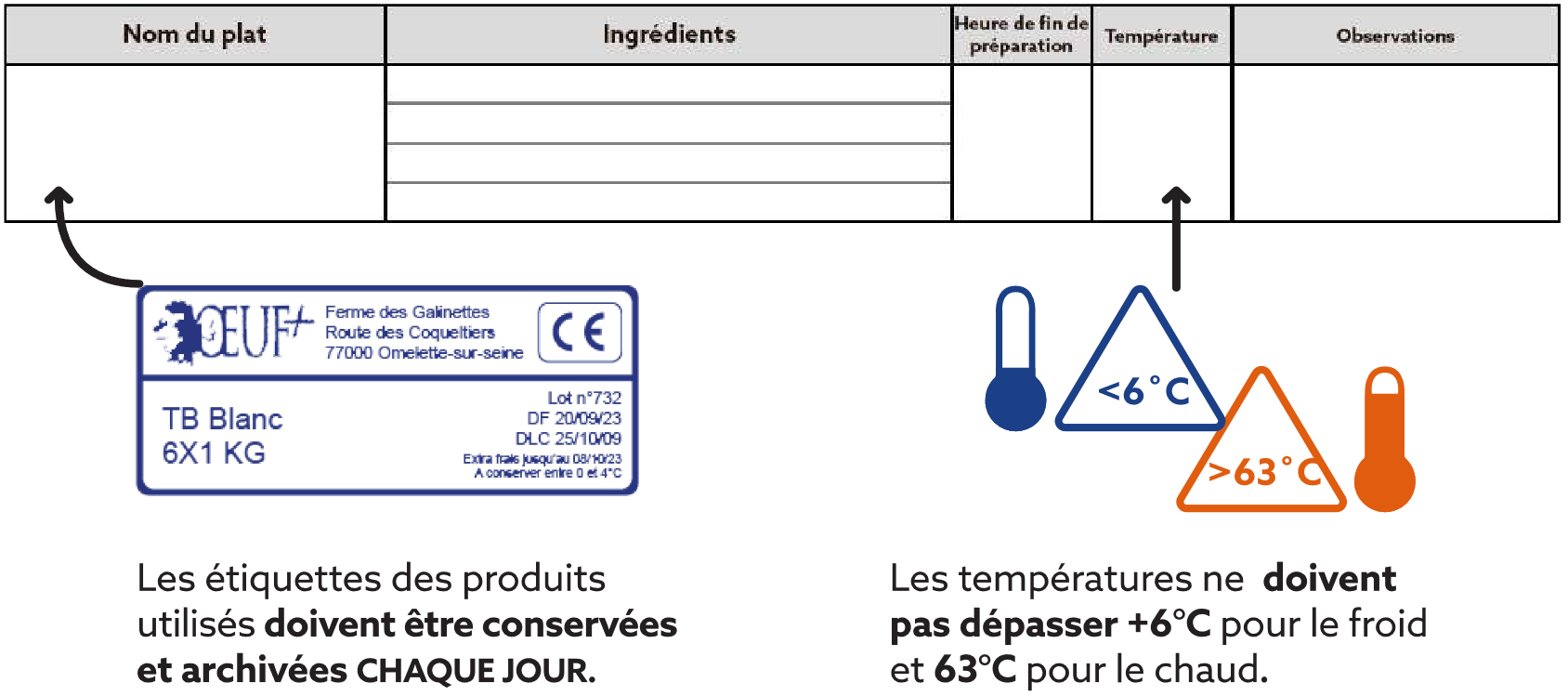 Ils doivent être identifés par une étiquette comportant le nom du produit, sa date d'ouverture et ses DLC primaires et internes.